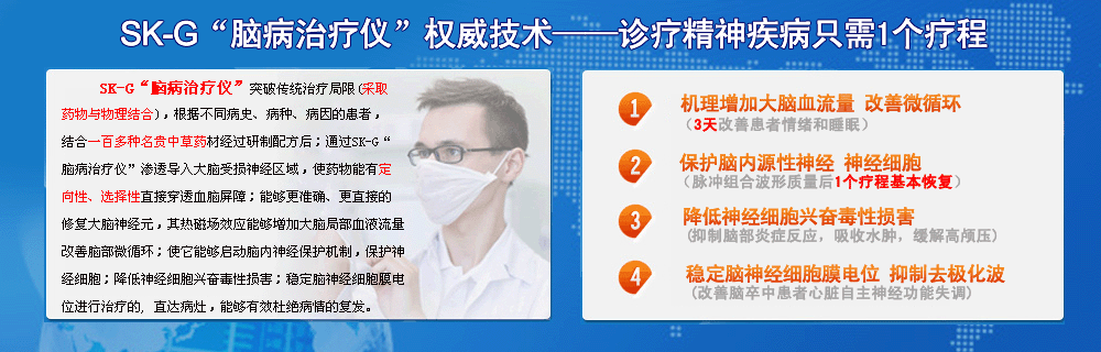世界精神疾病首席专家布鲁克先生:全世界超过4.5亿人遭受着精神或神经疾患的困扰,在WHO最新的报告中,WHO呼吁对精神疾病患者给与更多的理解,同时要求各国政府重视这一问题。国际SK-G“脑部治疗仪”领先技术应用于临床,由国家医学权威机构认证,并为各国精神科学界所重视。经过其后多年针对性的充实、完善与发展,更为成熟且反映更新发展变化医疗革命的改革。